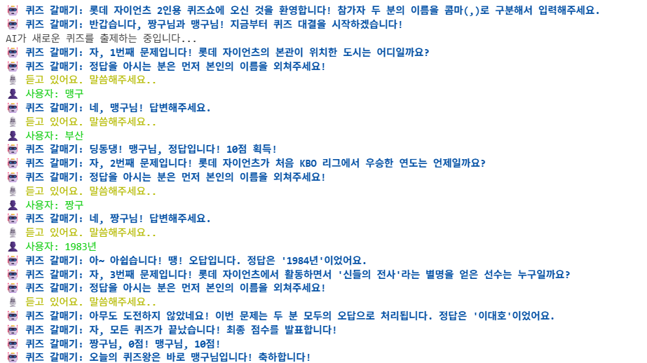 비록 프롬프트 엔지니어링만으로는 최신 정보를 반영하거나 모든 오류를 막는 데 한계가 있었지만, 두 명의 사용자를 구분하고, 점수를 기록하는 음성 봇을 완성할 수 있었어요.
