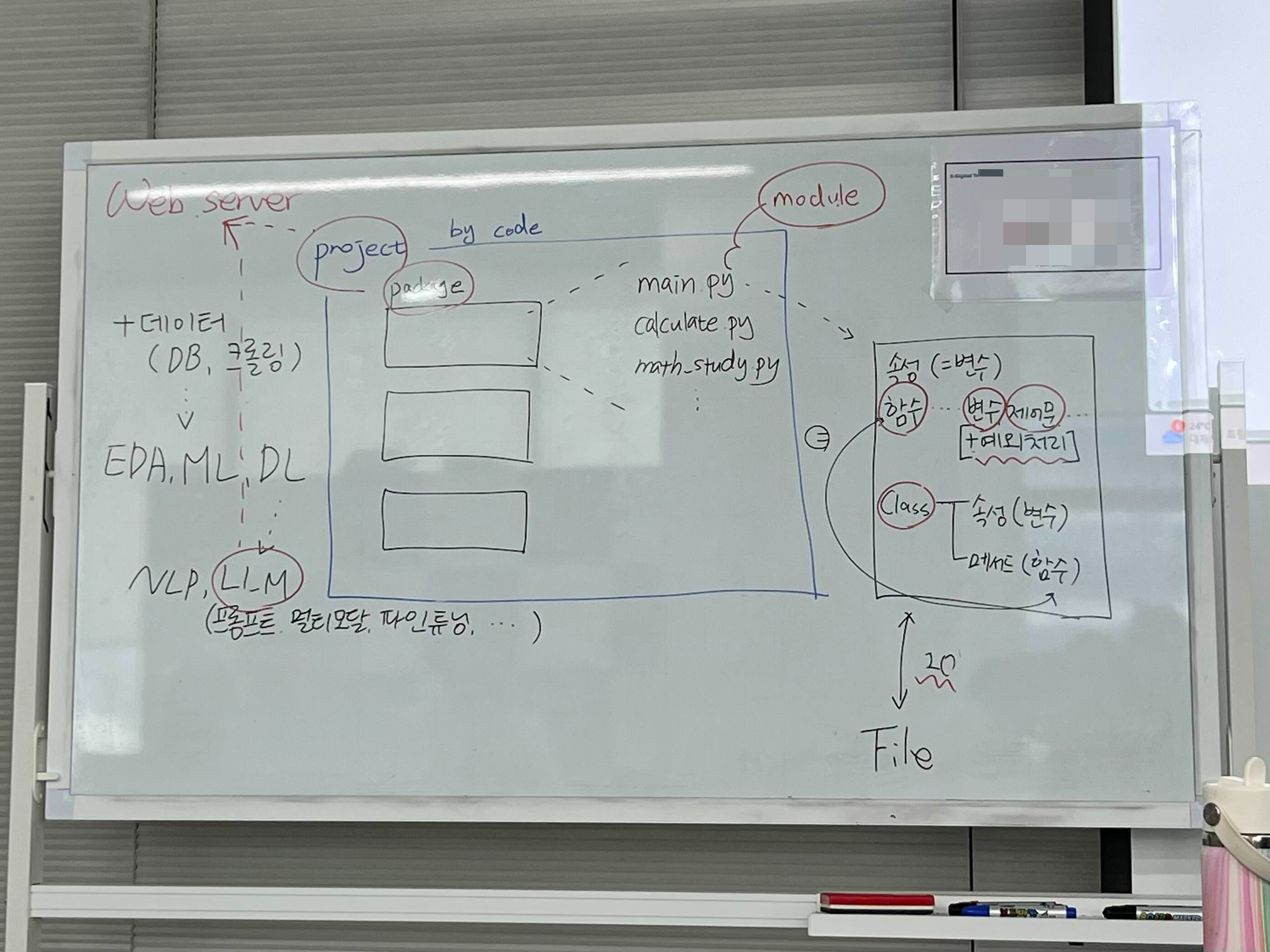 아래 사진은 과정 초기에 강사님께서 6개월 동안 배울 내용을 칠판에 간단하게 정리해 주셨던 그림인데요!
